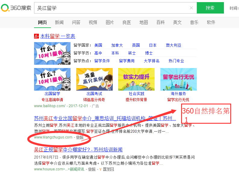 360seo自然排名:三个月之内苏州留学、苏州雅思培训、苏州托福培训、吴江留学、吴江雅思培训、吴江托福培训多个相关词均优化360首页。其中吴江地区相关词均优化到第一名。