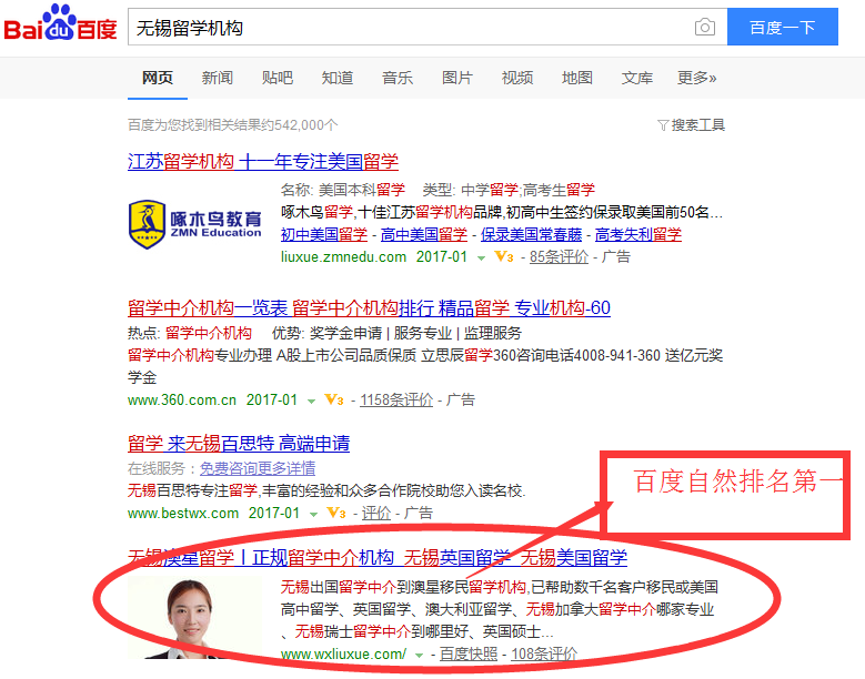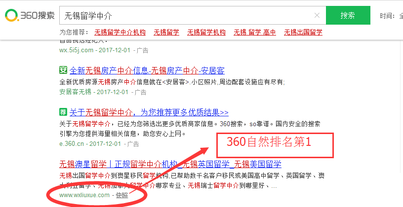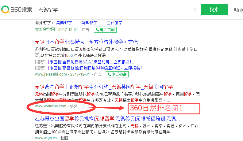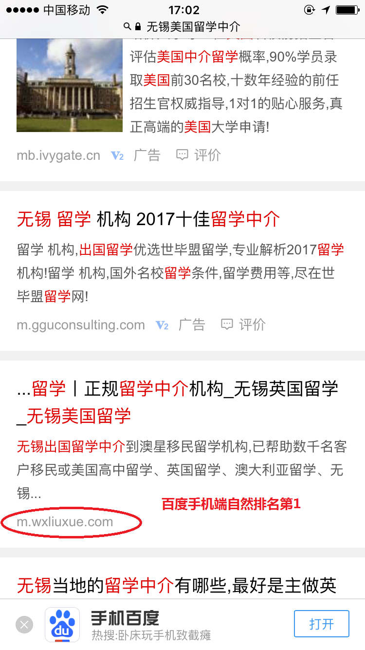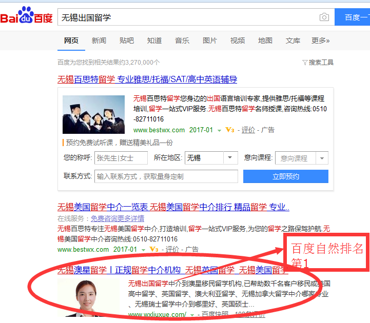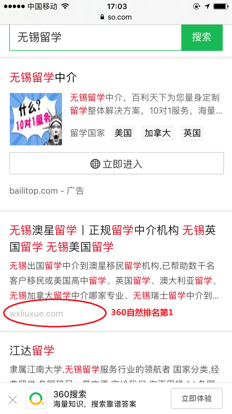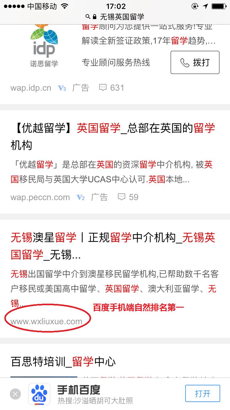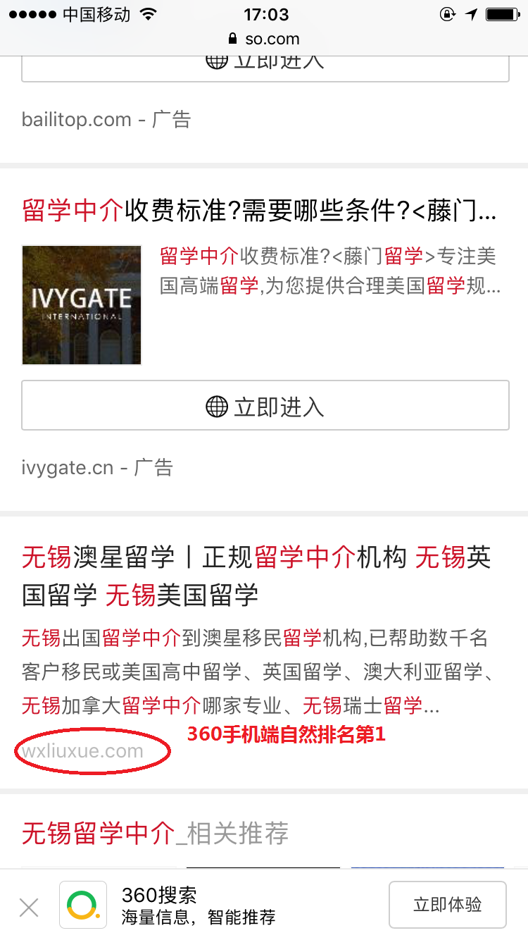 无锡网站优化案例:澳星留学,百度电脑端、百度手机端、360电脑端、360手机端相关关键词超过90%自然排名第一。地区留学客户引流量巨大。